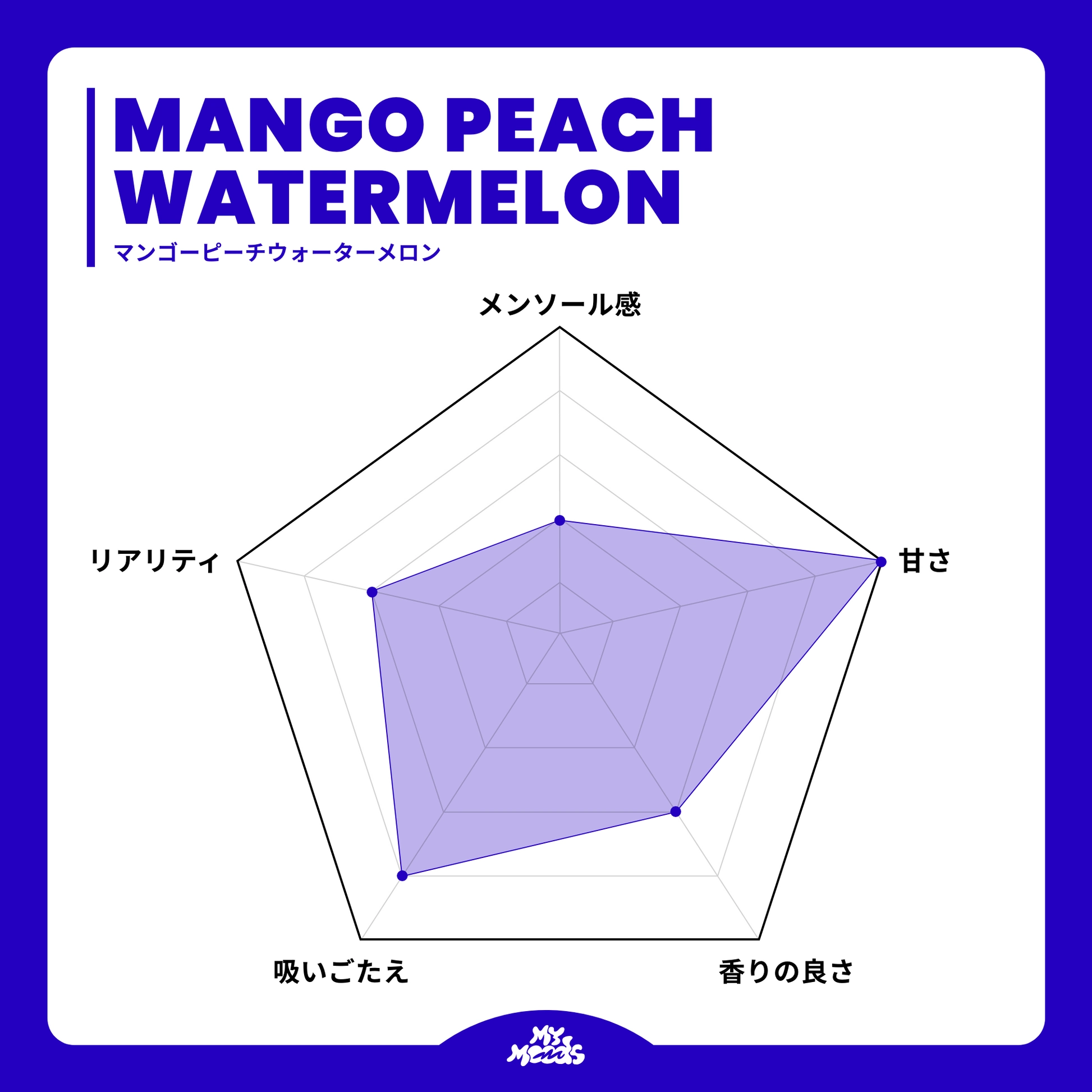「マンゴーピーチウォーターメロンのフレーバーがとても良いです! バッテリーの持ちも申し分なく、甘くて爽やかな味わいでリフレッシュできます。使い心地が良く、満足しています。おすすめです!」